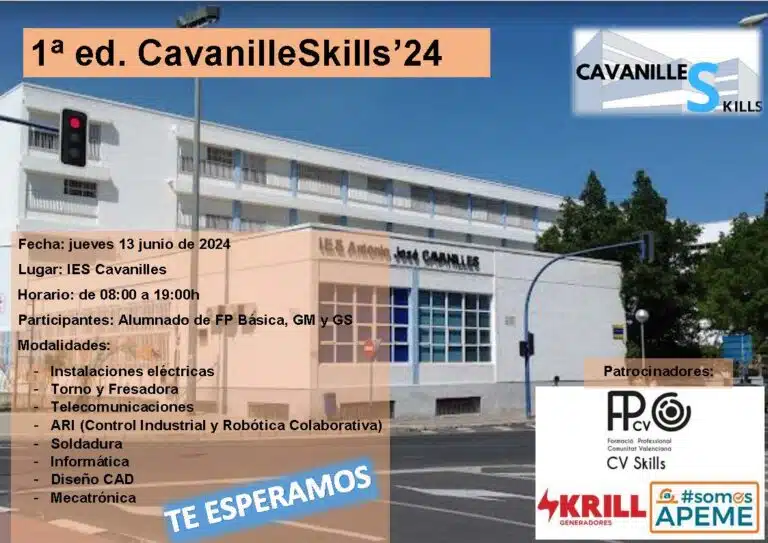 APEME es uno de los patrocinadores de la Primera Edición de CavanilleSkills’24. Fecha: Jueves, 13 de junio de 2024. Lugar: IES Cavanilles. Horario: 08:00 a