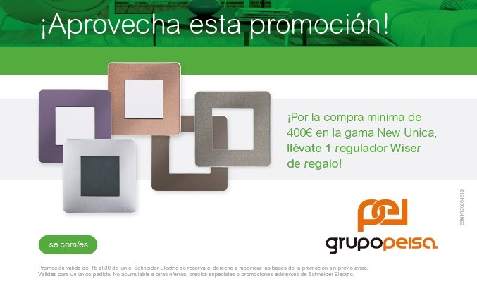 Aprovecha esta magnífica promoción que te ofrecen Grupo Peisa y Schneider por una compra mínima de 400€ de la gama New Unica, ¡¡llévate un regulador Wiser de regalo!!