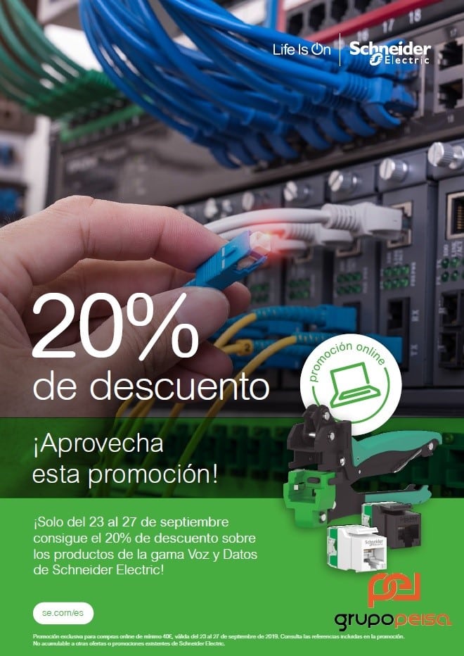 Aprovecha esta magnífica promoción que te ofrecen Grupo Peisa y Schneider en la compra de productos Voz y Datos durante la semana del 23 al 27 de septiembre. ¡¡Obtén un descuento de un 20% en tus compras!!
