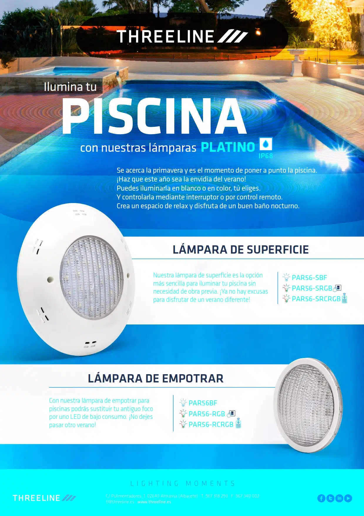 Es el momento de preparar las zonas exteriores y piscinas para este verano, y desde THREELINE queremos facilitarte la distinción de los diferentes modelos y características de cada una de nuestras lámparas PAR56, de la familia PLATINO.