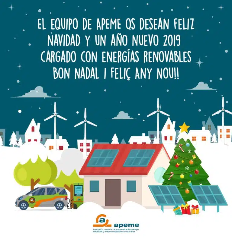 El equipo de APEME os desean Feliz Navidad y un Año Nuevo 2019 cargado con energías renovables. Bon Nadal y Feliç Any Nou!! Les recordamos que