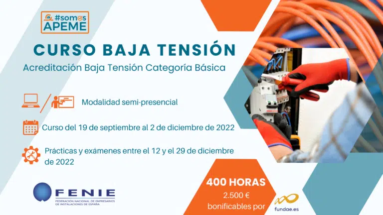 En Campus APEME ponemos en marcha, a través de FENIE, la convocatoria del Curso REBT Básico: 400 Horas. Formación online y prácticas presenciales. Examen final teórico-práctico. Curso del 19 de